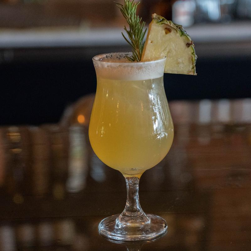 A reengineered Piña Colada built with coconut and spiced rum, pineapple, and tiki bitters, on the rocks.